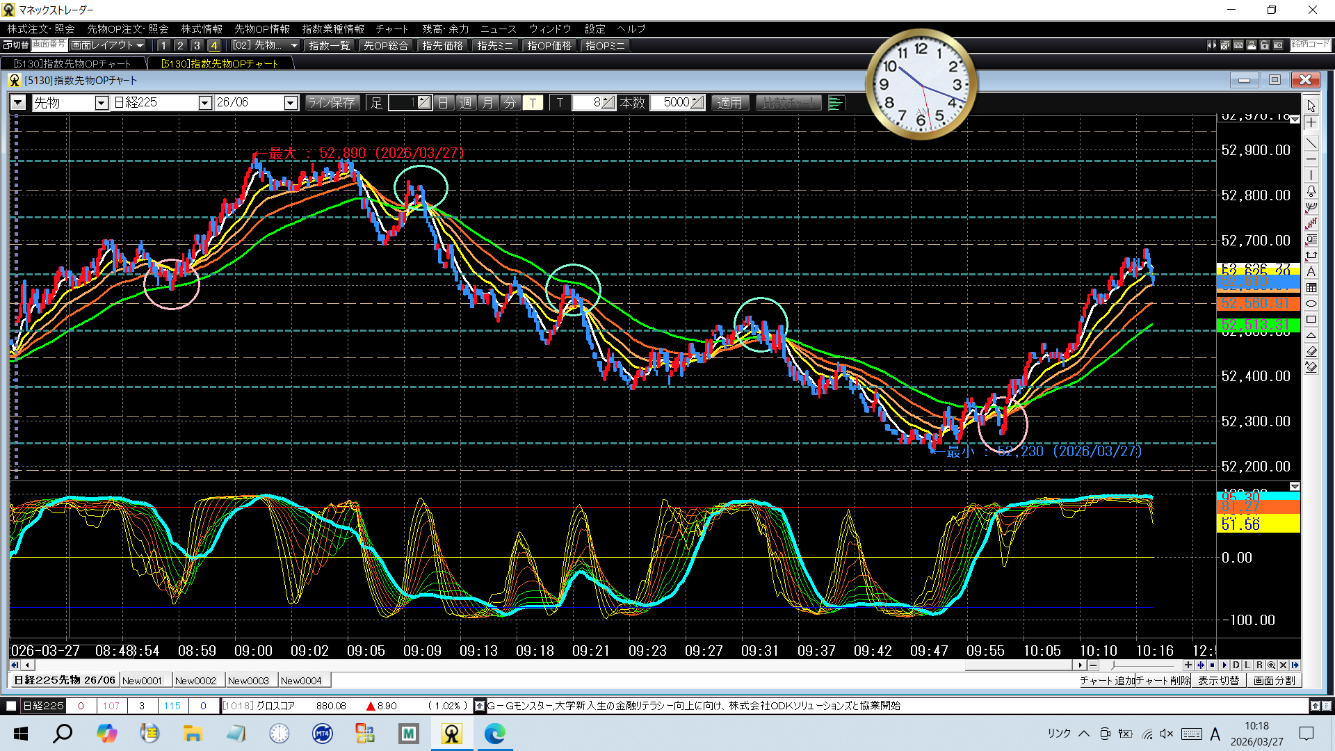 3月27日(金) 未分類 2026.03.27 ( 8:59) 52625 買 52810 売決済 +185( 9:10) 52810 売 52560 買決済 +250( 9:21) 52560 売 52440 買決済 +120( 9:32) 52500 売 52250 買決済 +250(10:01) 52310 買 52625 売決済 +315