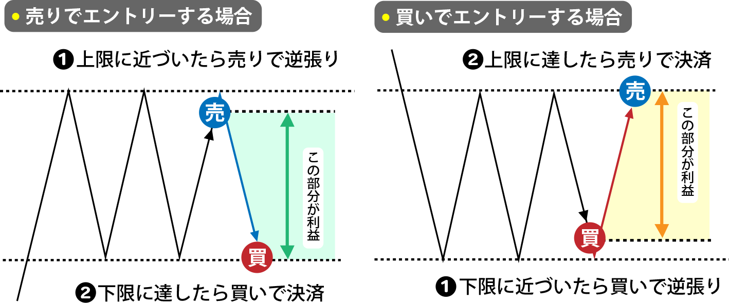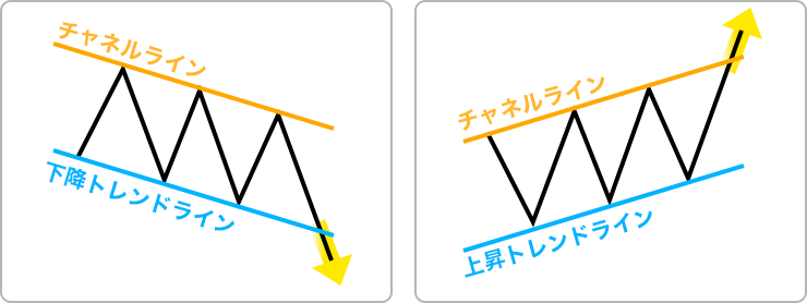 ある一定の価格を上下する動きの場合、その上限と下限に水平線を引きます。