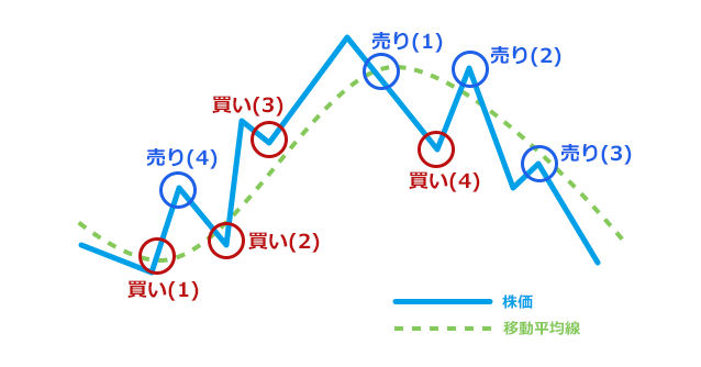 株価と移動平均線の組み合わせや位置によって売買のタイミングを判断しようというものです。